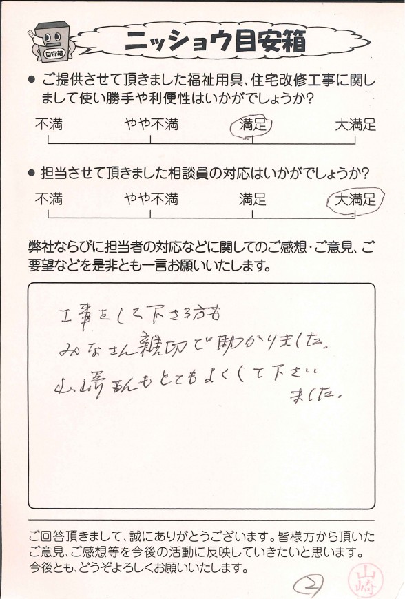 弊社では、福祉用具レンタル、購入、住宅改修をご利用いただいたお客様にアンケートハガキのご記入をお願いしております。その中からお客様の声の一部を公開させていただきました。お返事をくださった皆様、大変ありがとうございました。