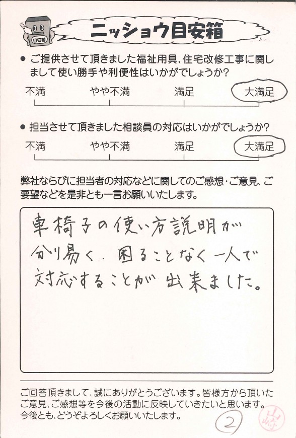 弊社では、福祉用具レンタル、購入、住宅改修をご利用いただいたお客様にアンケートハガキのご記入をお願いしております。その中からお客様の声の一部を公開させていただきました。お返事をくださった皆様、大変ありがとうございました。