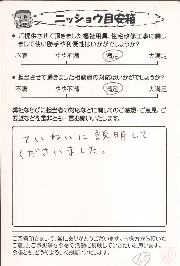 弊社では、福祉用具レンタル、購入、住宅改修をご利用いただいたお客様にアンケートハガキのご記入をお願いしております。その中からお客様の声の一部を公開させていただきました。お返事をくださった皆様、大変ありがとうございました。