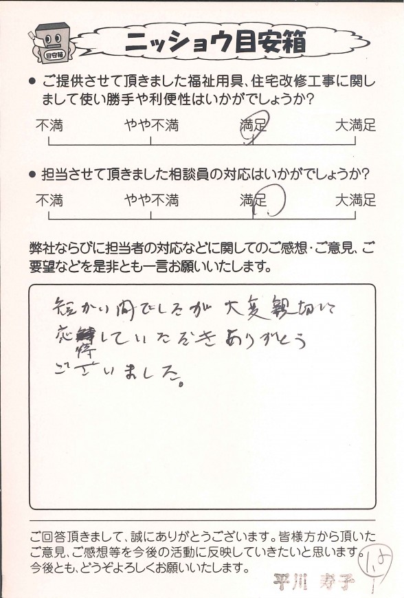 弊社では、福祉用具レンタル、購入、住宅改修をご利用いただいたお客様にアンケートハガキのご記入をお願いしております。その中からお客様の声の一部を公開させていただきました。お返事をくださった皆様、大変ありがとうございました。