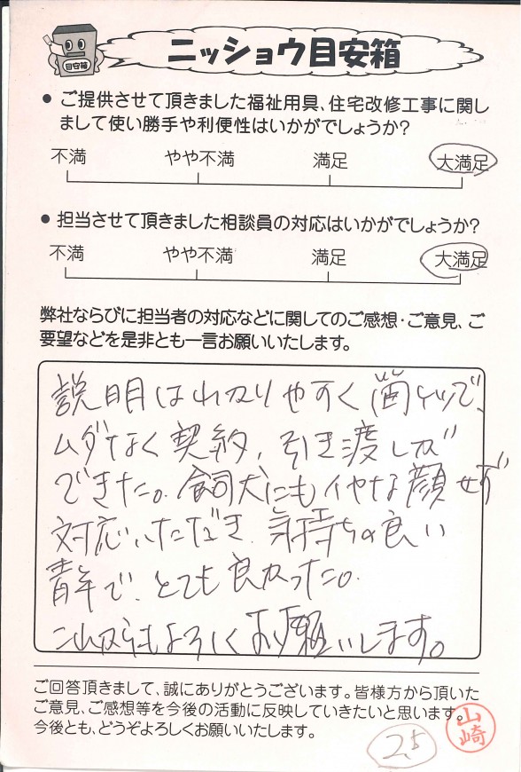 弊社では、福祉用具レンタル、購入、住宅改修をご利用いただいたお客様にアンケートハガキのご記入をお願いしております。その中からお客様の声の一部を公開させていただきました。お返事をくださった皆様、大変ありがとうございました。
