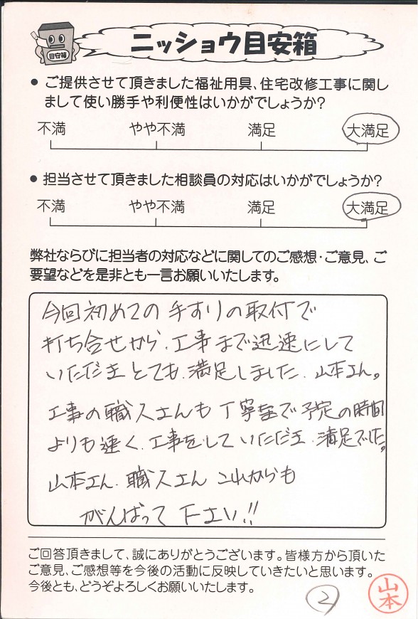 弊社では、福祉用具レンタル、購入、住宅改修をご利用いただいたお客様にアンケートハガキのご記入をお願いしております。その中からお客様の声の一部を公開させていただきました。お返事をくださった皆様、大変ありがとうございました。