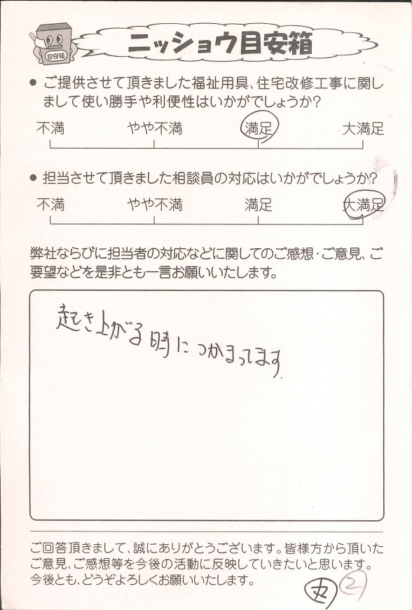 弊社では、福祉用具レンタル、購入、住宅改修をご利用いただいたお客様にアンケートハガキのご記入をお願いしております。その中からお客様の声の一部を公開させていただきました。お返事をくださった皆様、大変ありがとうございました。